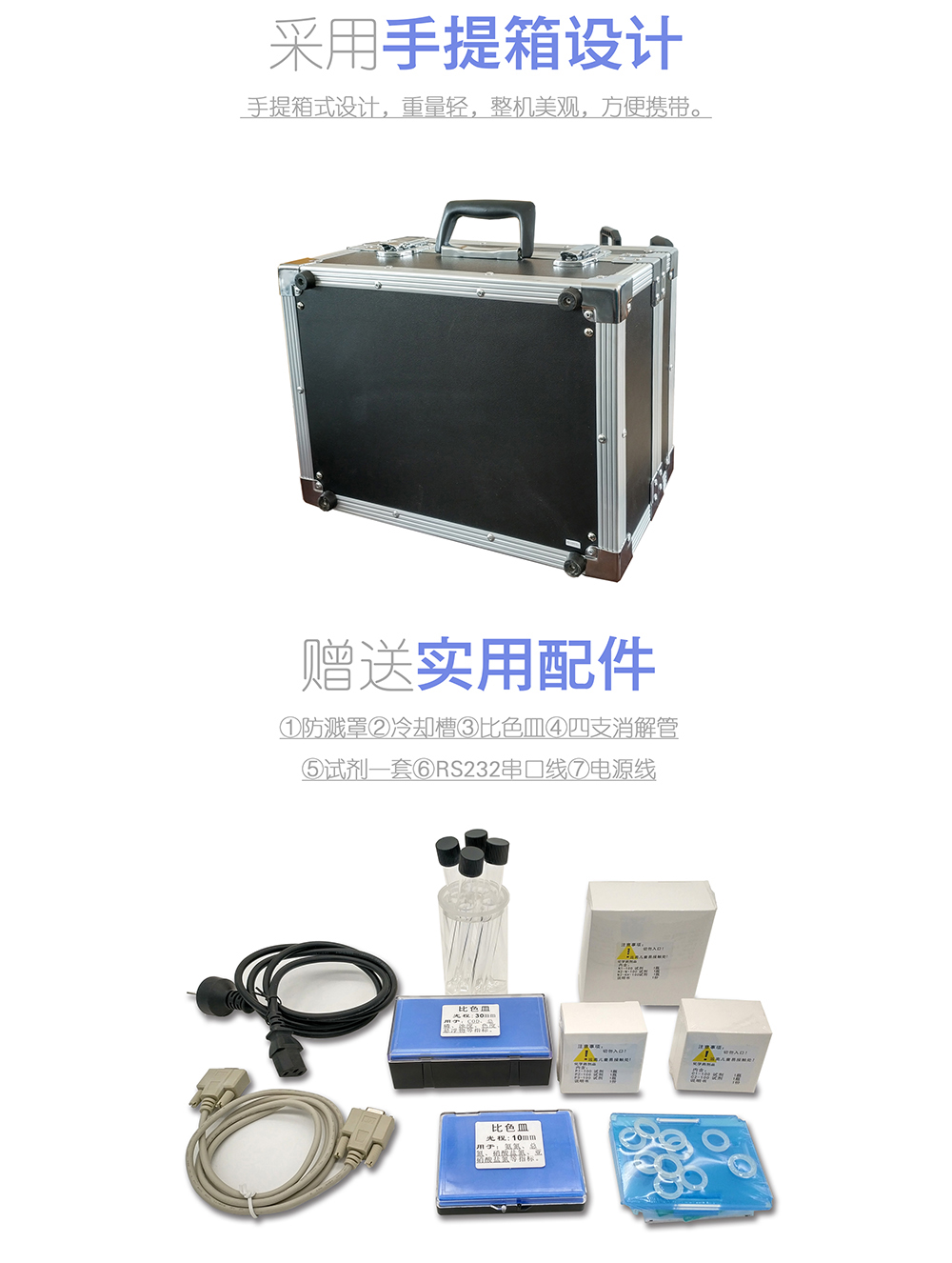 13.手提箱式設(shè)計(jì),重量輕,整機(jī)美觀,方便攜帶;