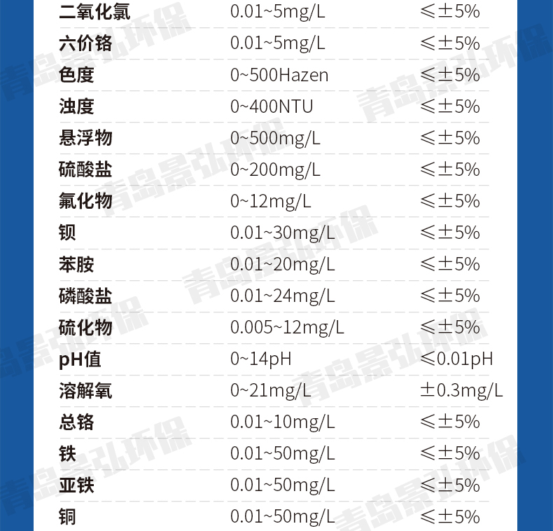 ② 測(cè)定范圍:0.01mg/L~5mg/L(>1mg/L時(shí)分段測(cè)定,超量程可稀釋測(cè)量);